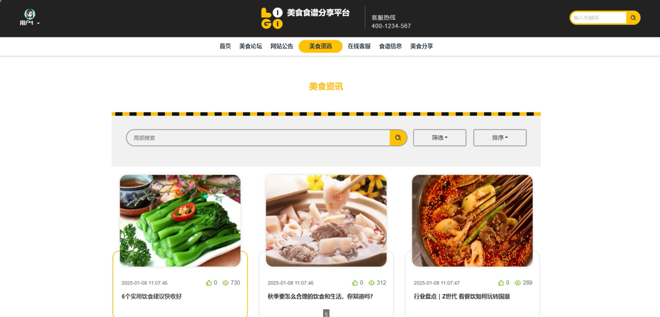 平台的主体架构包含首页、美食论坛、个人中心、美食功能模块、在线客服系统及管理员后台等多个核心组成部分。首页集中展示了美食资讯、食谱信息和美食分享等内容,便于用户快速获取所需信息;美食论坛为用户提供了交流美食心得、分享烹饪经验的平台;个人中心允许用户管理个人信息、收藏食谱及查看评论记录等;美食功能模块则涵盖了丰富的食谱资源、最新的美食资讯及便捷的分享功能;在线客服系统能为用户提供即时的咨询支持;管理员后台则负责全面的网站运营管理,包括用户信息管理、食谱分类与信息管理、美食分享内容审核、公告发布、资源管理、留言处理及论坛监控等。