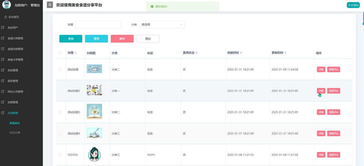 资源管理:管理员能够查看美食论坛列表中的某个论坛详情和评论。还可以对美食论坛和论坛分类信息进行增删改查操作,以维护论坛内容的秩序和质量。