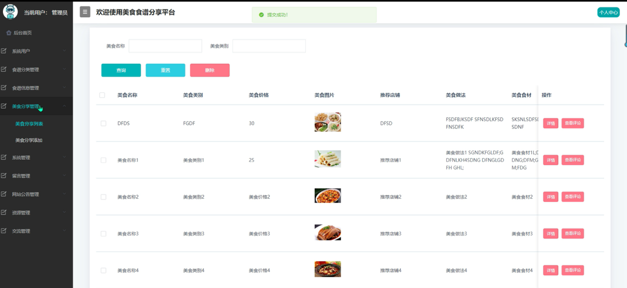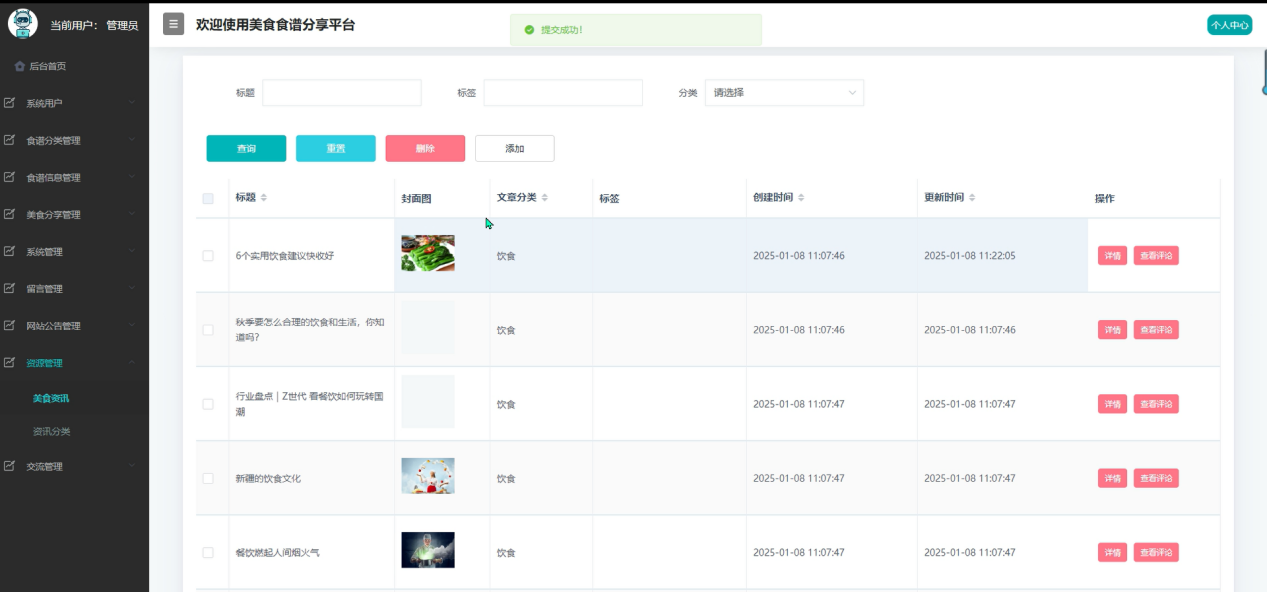 食谱分类管理:管理员能够添加新的食谱分类信息,如按照菜系、菜品类型等进行分类。对已有的食谱分类信息进行查询、修改或删除操作。