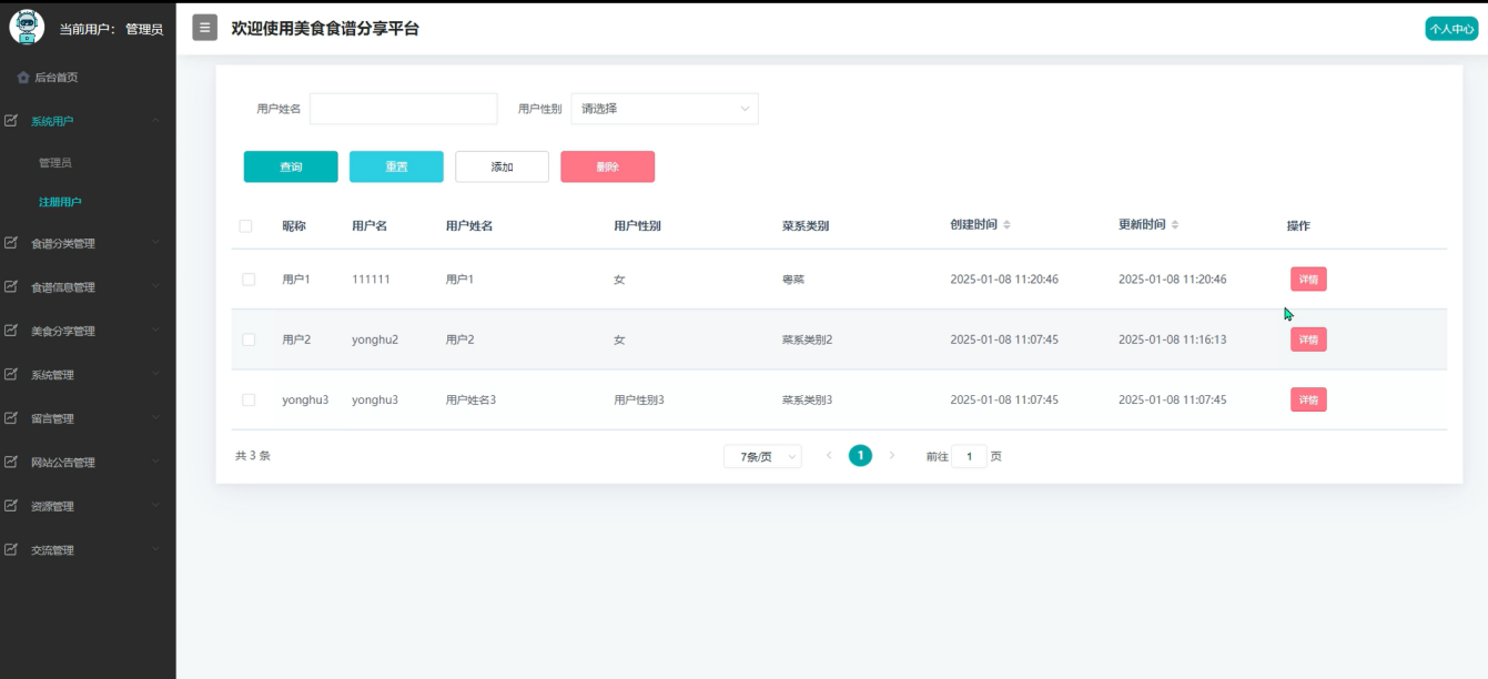 用户管理:管理员能够查看系统用户列表,并查看某个用户的详情。管理员能够对用户信息进行增删改查操作,以维护平台用户信息的准确性和完整性。