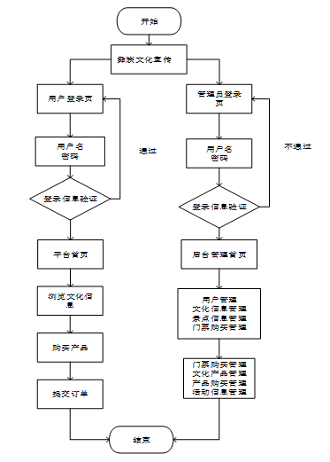 彝族文化宣传系统总体工作流程包含管理员登录后台系统可以管理所有文化信息,用户可以在登录系统后进行文化浏览和购买文化产品等功能流程,系统的总体工作流程如图4-3所示。