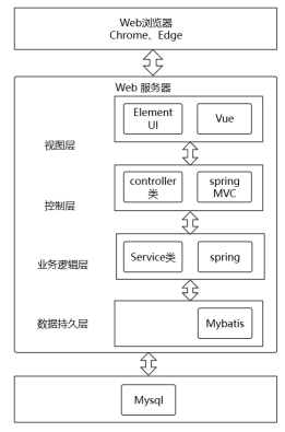 本项目采用B/S架构,遵循MVC设计思想,采用前后端分离的方式进行架构搭建。系统主要由表示层、控制层、业务逻辑层和数据层构成,系统架构如图4-1所示。