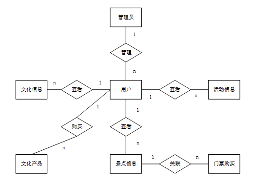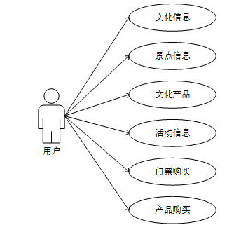 系统提供文化信息、景点信息、文化产品、活动信息、门票购买和餐品购买等功能。用户可以浏览文化信息和景点信息,查看详细介绍。通过文化产品功能,用户可以查看并选择不同的文化商品。活动信息模块提供最新活动安排,用户可以了解参与的相关信息。用户还可以在门票购买功能中选择目标景点并完成门票购买流程,产品购买功能则支持用户购买景点内的产品。用户功能用例图如图3-1所示。