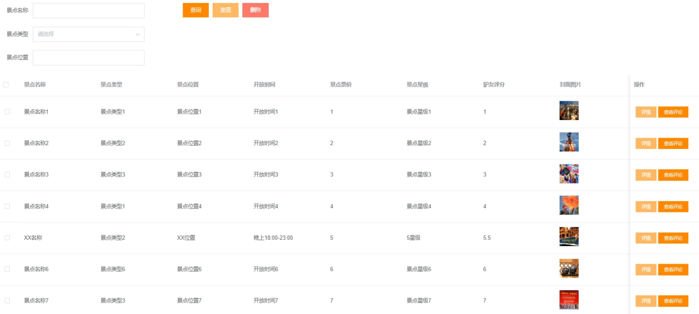 管理员在后台选择“景点信息管理”模块,进入景点信息列表页面。管理员可以对每个景点信息进行查看、编辑或删除。点击“新增景点”按钮,管理员可以添加新的景点信息。景点信息管理页面效果如图5-9所示。