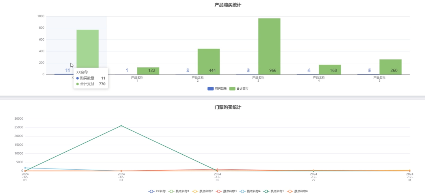 系统可以展示产品购买和门票购买的统计图表,图表根据不同维度展示购买情况,还可以展示门票购买的统计图表。管理员可以根据不同时间段、景点等筛选条件,查看各类统计数据。数据统计页面效果如图5-14所示。