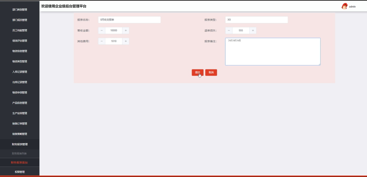 财务报表管理: 管理员可以查看公司财务报表的详细数据,并可添加、查询、重置财务报表。管理员还可以导出财务报表,便于进行进一步分析或汇报。删除功能使得管理员能够清理无效或过时的报表记录。