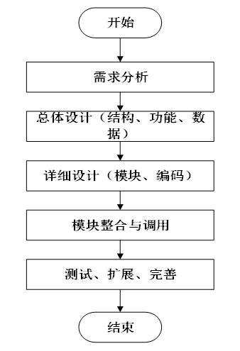 系统开发流程的主要步骤,从需求分析到系统完成的全过程。流程包括需求分析、总体设计(结构、功能、数据)、详细设计(模块、编码)、模块整合与调用,以及测试、扩展和完善,最终完成系统的开发。本系统的开发流程如下图所示