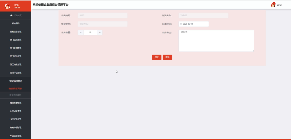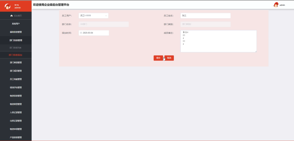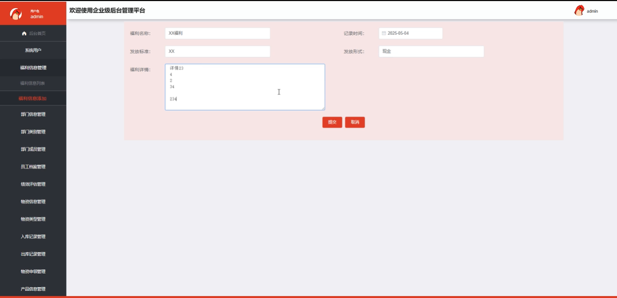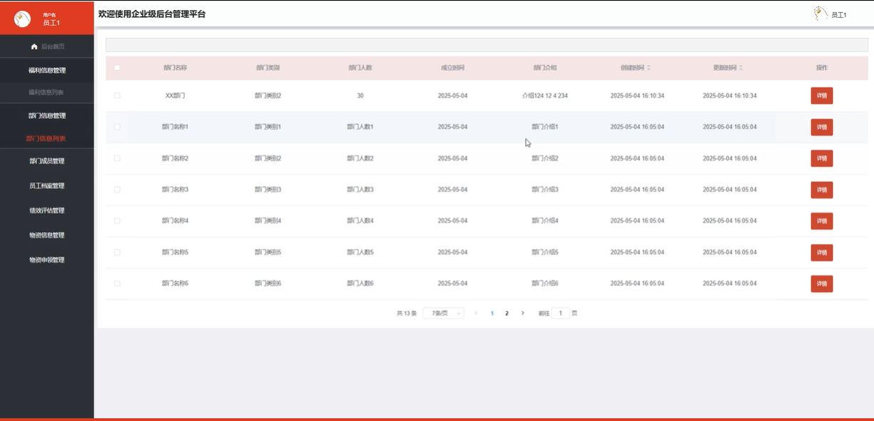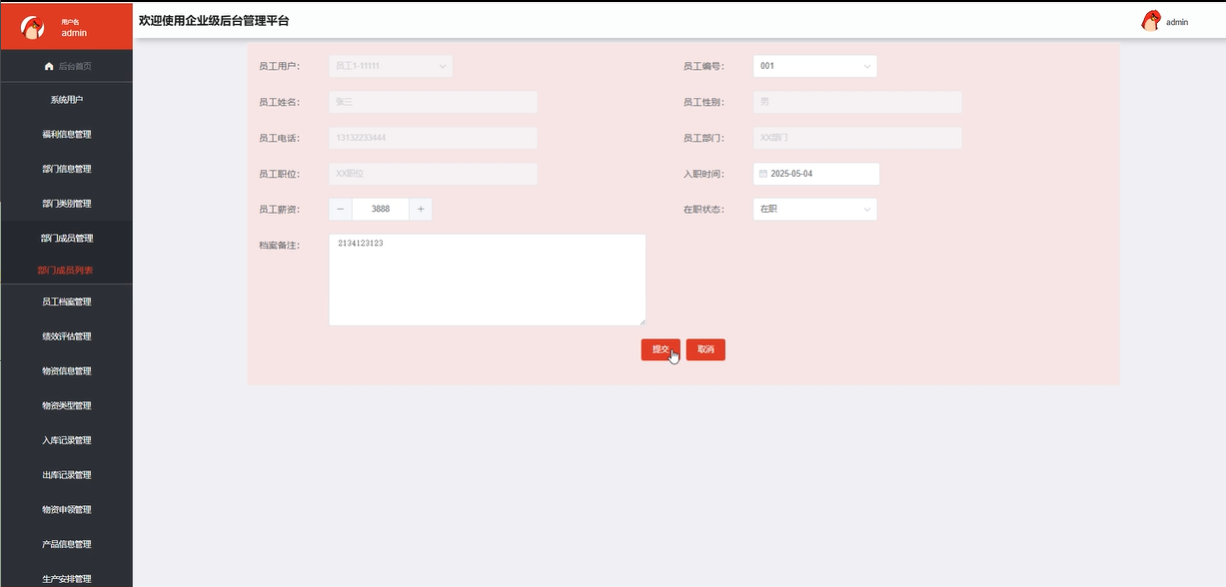 本系统基于 SpringBoot 后端框架与 Vue2 前端技术,构建了一个功能完善的企业级后台管理平台。系统主要面向管理员与员工用户,涵盖人事、物资、绩效、财务及产品等多个管理模块。员工用户可查看福利、部门、档案等信息,并进行物资申领操作;管理员则具备更全面的管理权限,包括用户管理、数据维护、权限分配以及各类业务信息的增删改查操作。通过前后端分离架构,系统实现了高效的数据交互与清晰的业务逻辑划分,提升了企业内部管理的便捷性与规范性。