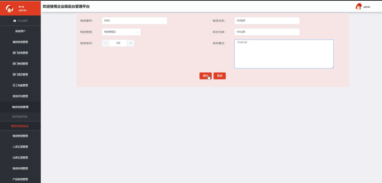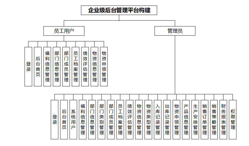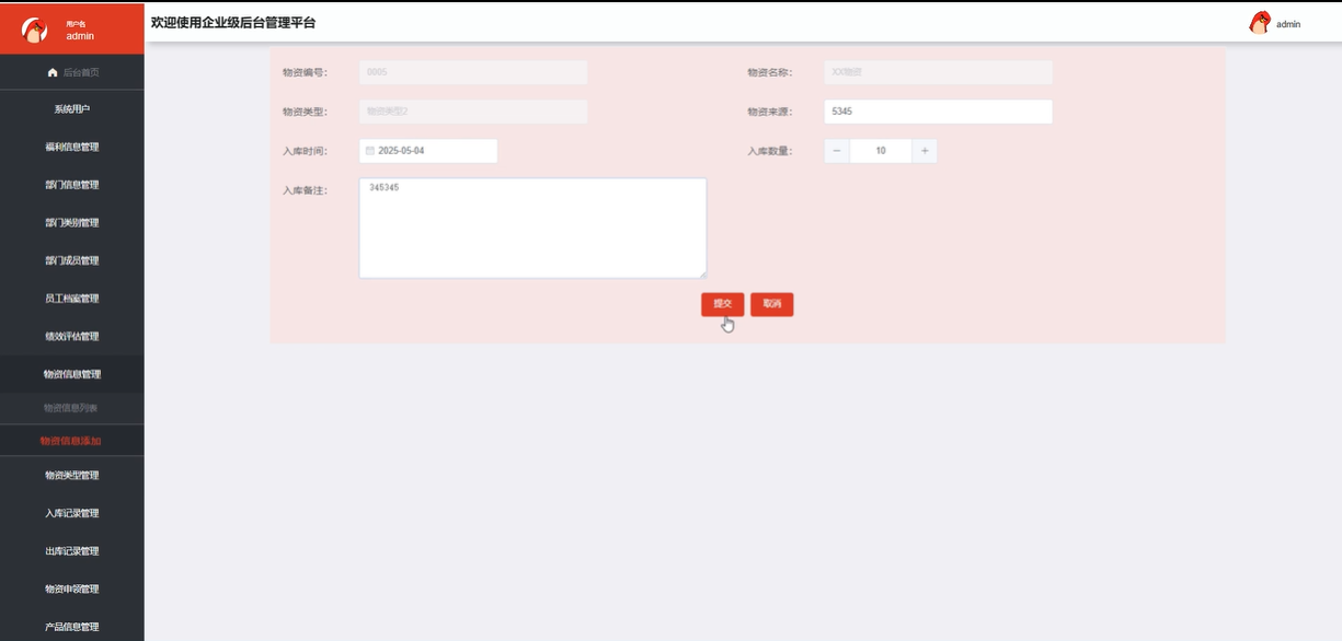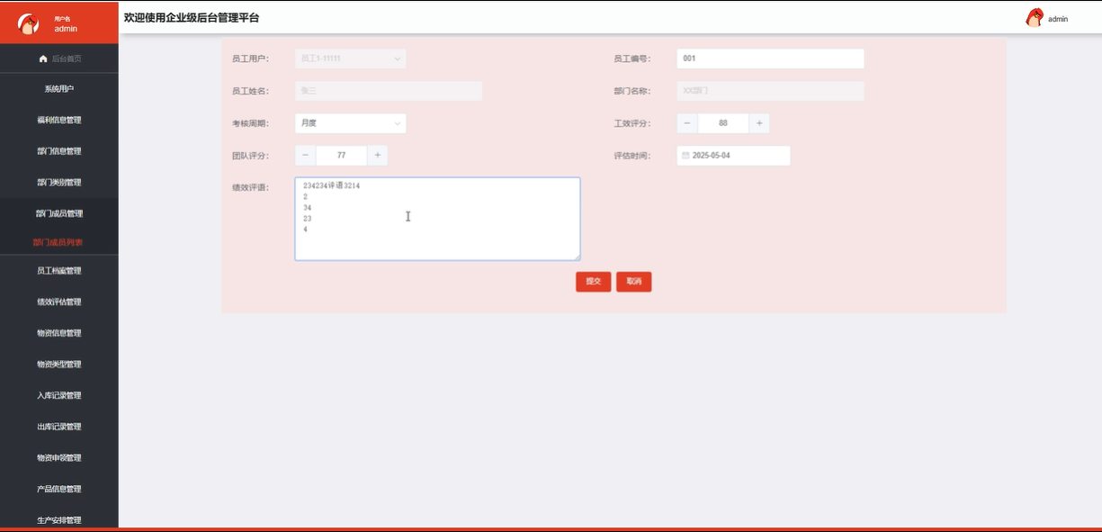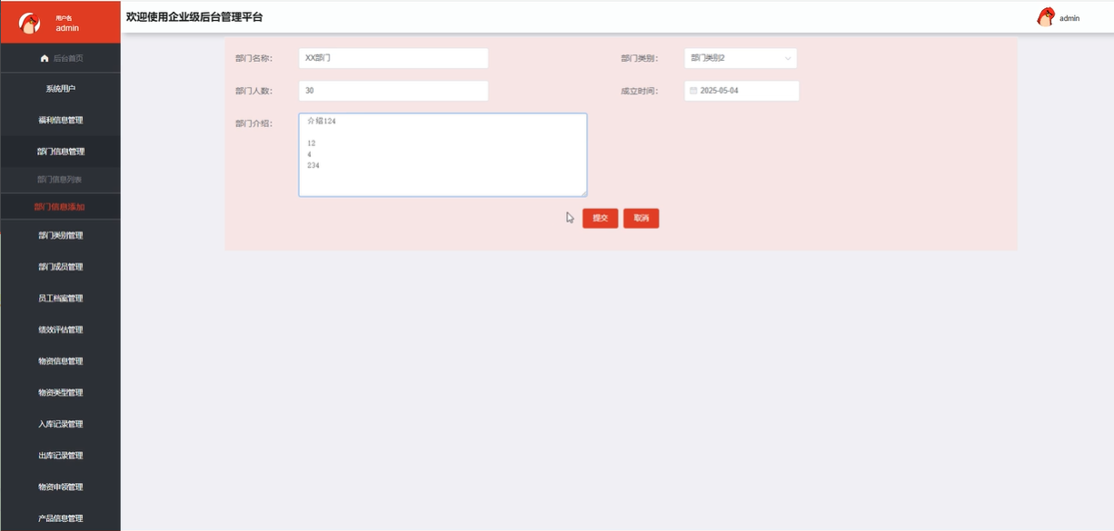 本系统基于 SpringBoot 后端框架与 Vue2 前端技术,构建了一个功能完善的企业级后台管理平台。系统主要面向管理员与员工用户,涵盖人事、物资、绩效、财务及产品等多个管理模块。员工用户可查看福利、部门、档案等信息,并进行物资申领操作;管理员则具备更全面的管理权限,包括用户管理、数据维护、权限分配以及各类业务信息的增删改查操作。通过前后端分离架构,系统实现了高效的数据交互与清晰的业务逻辑划分,提升了企业内部管理的便捷性与规范性。