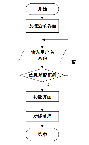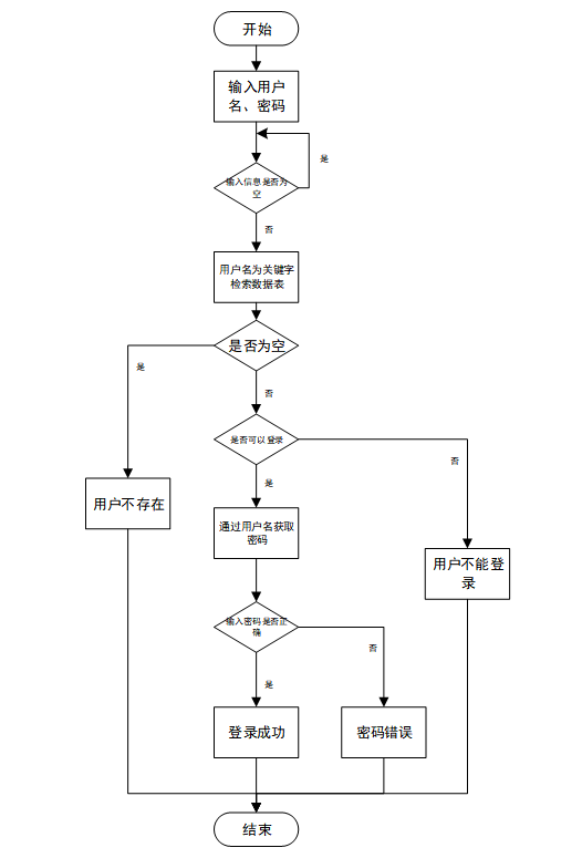 用户输入用户名和密码后,系统先检查输入是否为空,再验证用户名是否存在,若存在则通过用户名获取密码并校验。若密码正确则登录成功,否则提示密码错误。若用户名不存在或无法登录,提示用户操作无效。如下图所示。