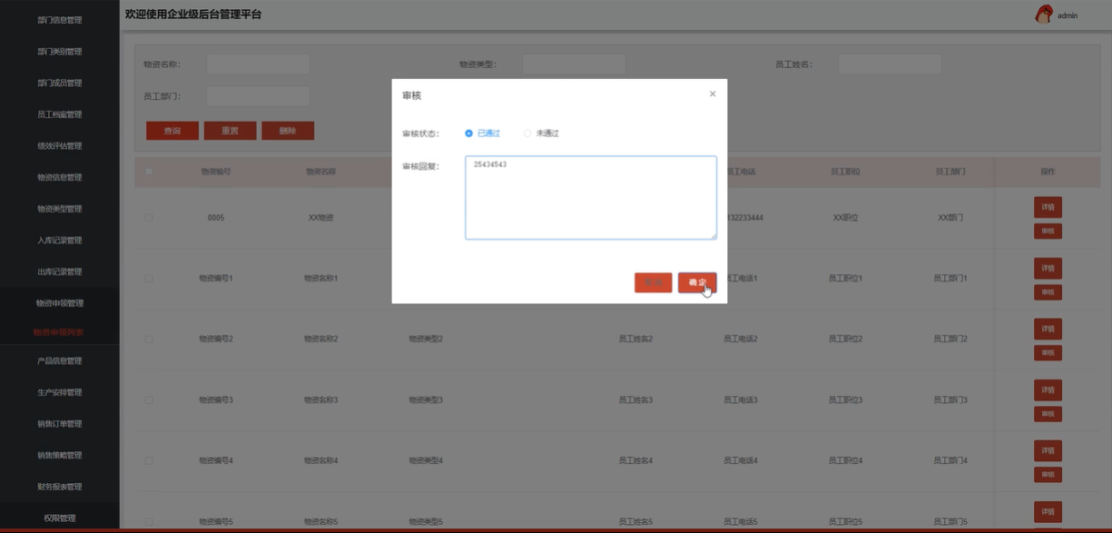 物资申领管理: 管理员可查看员工提交的物资申领信息,审核物资申领请求。管理员可对申领记录进行详细查看、查询和重置操作,并能够删除不合规的申领记录,确保物资申领流程的顺畅与规范。