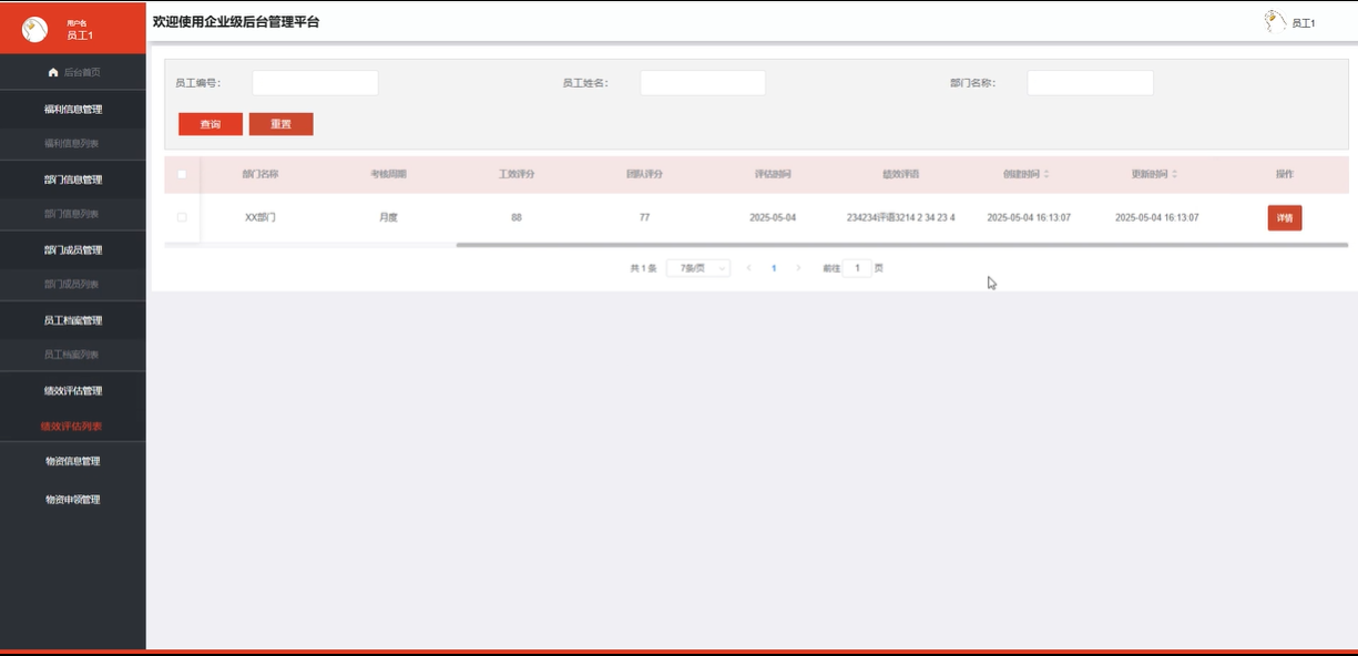 绩效评估管理: 管理员能够查看并管理员工的绩效评估信息。管理员可以通过搜索与查询功能,查看特定时间段或员工的绩效评估结果,并可对评估数据进行删除、重置等操作。