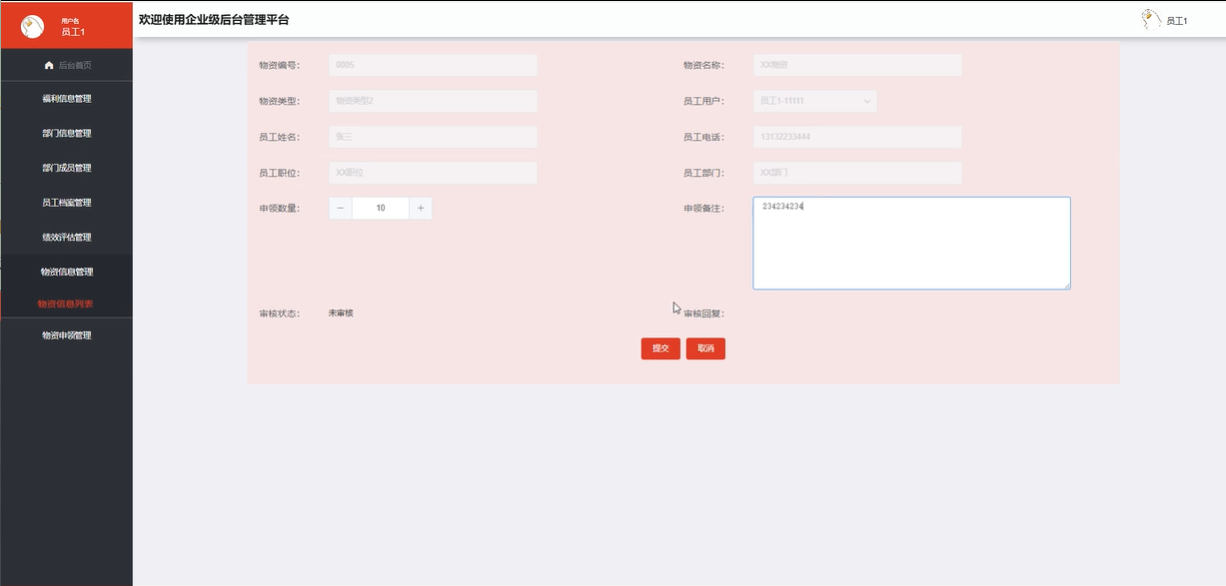 物资信息管理:员工可以查看公司提供的各类物资信息,包括物资名称、类别、库存情况等。员工可以根据自己的需求进行物资申领,通过搜索和查询功能方便地找到所需物品。同时,员工也可以利用重置功能清除之前的查询记录,确保搜索条件的精准性。
