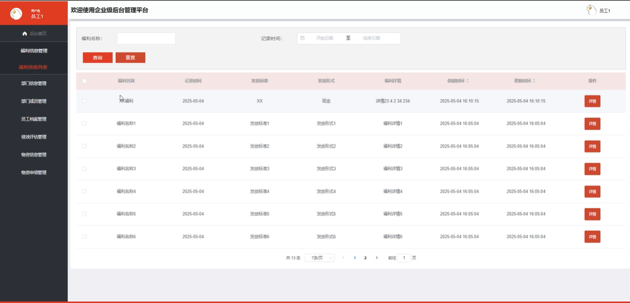 福利信息管理: 管理员可以查看公司福利信息的详细内容,并进行新增、编辑和删除操作。管理员可通过搜索功能快速查找特定福利信息,支持查询和重置操作,确保福利信息的及时更新与管理。