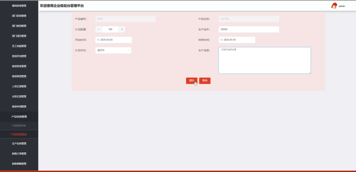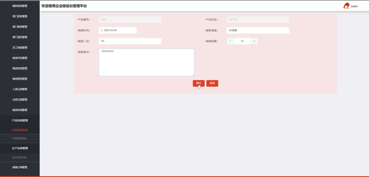 产品信息管理: 管理员可以查看公司产品的详细信息,并进行生产安排、记录销售订单和安排销售策略等操作。管理员可以添加新产品信息、进行搜索和查询,确保产品管理的完整性和高效性。