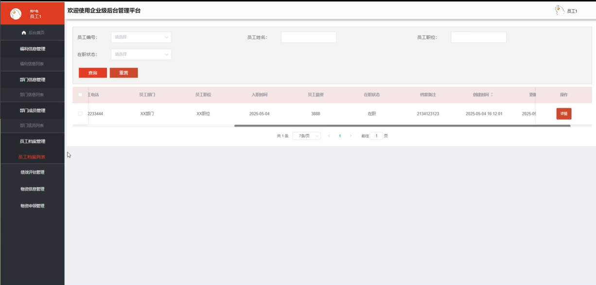 员工档案管理: 管理员可以查看和管理员工的个人档案,包括员工的基本信息、工作经历等。管理员可以通过搜索、查询以及重置功能,便捷地查看不同员工的档案信息,保证档案资料的完整与及时更新。