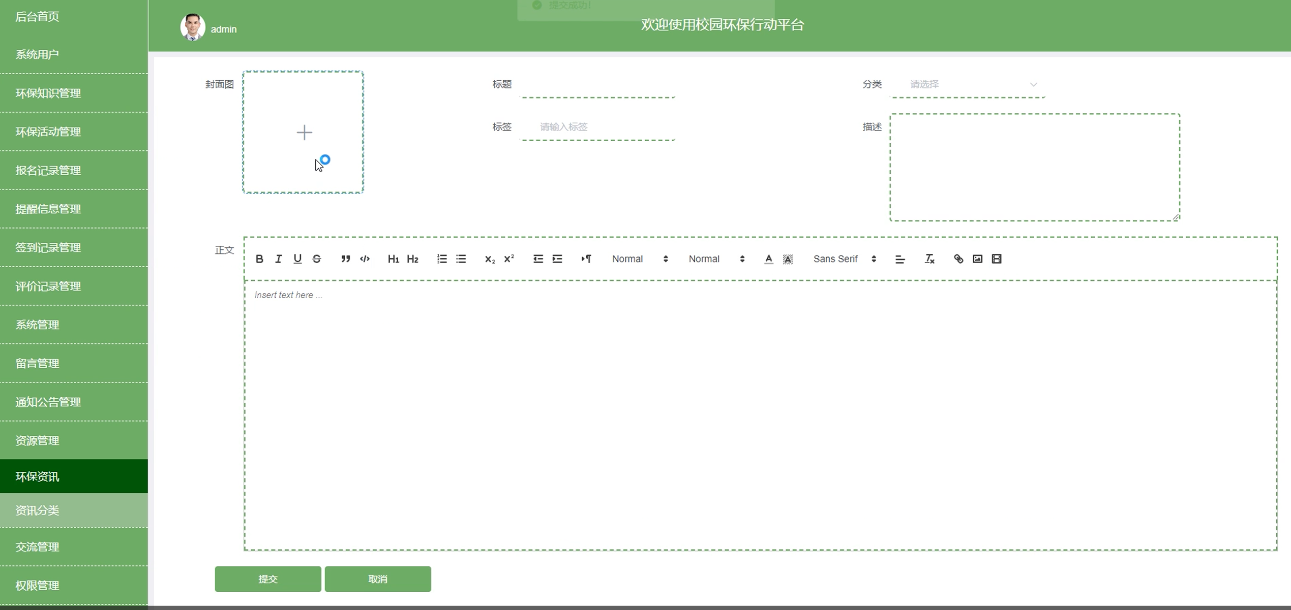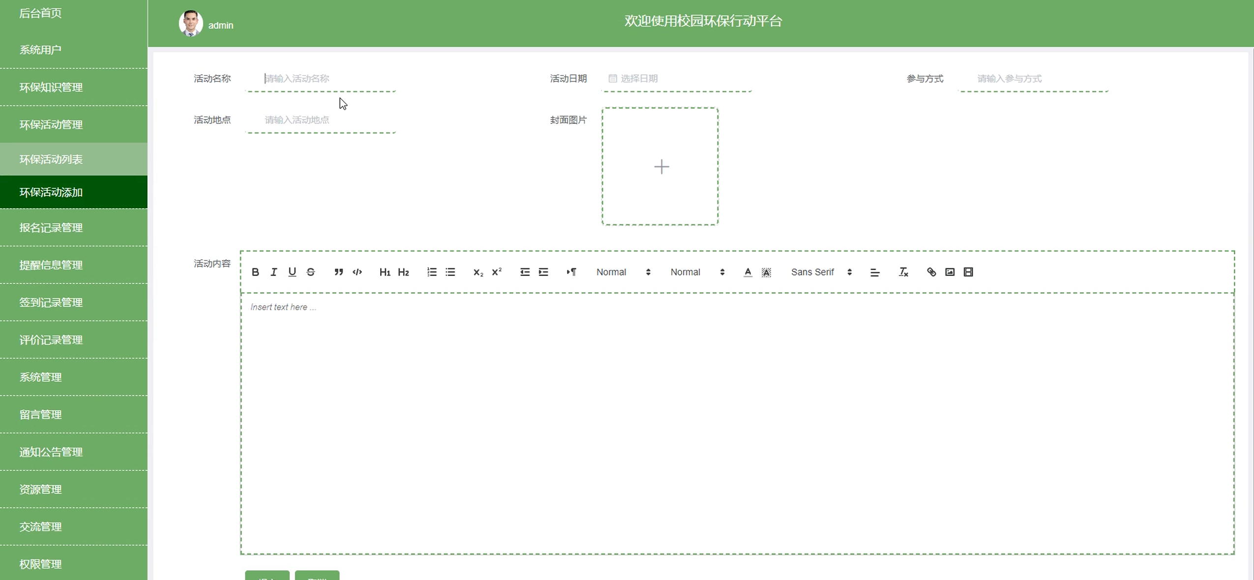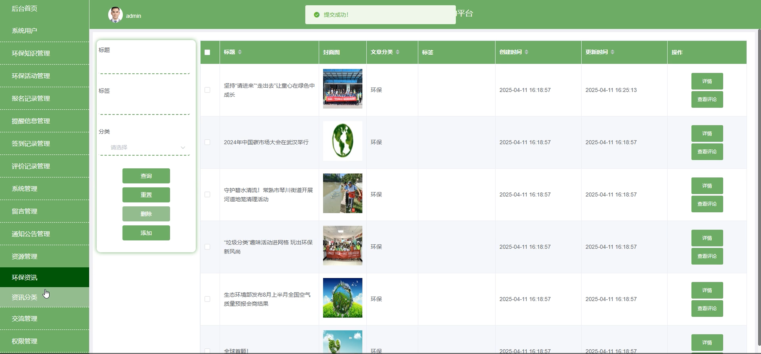 - 资源管理:管理员可以管理平台上的资源信息,如环保文章、图片、活动资料等。确保资源的有效管理和分类。