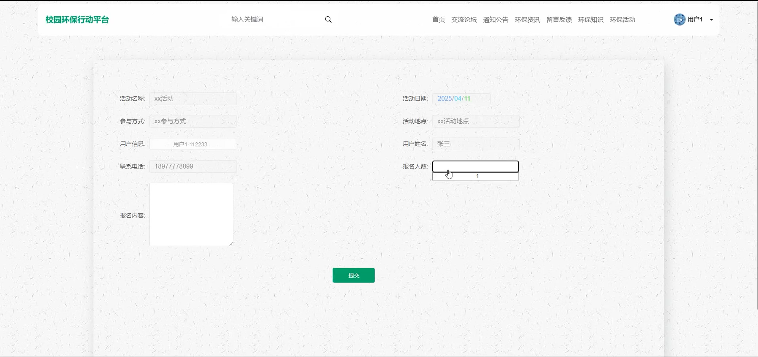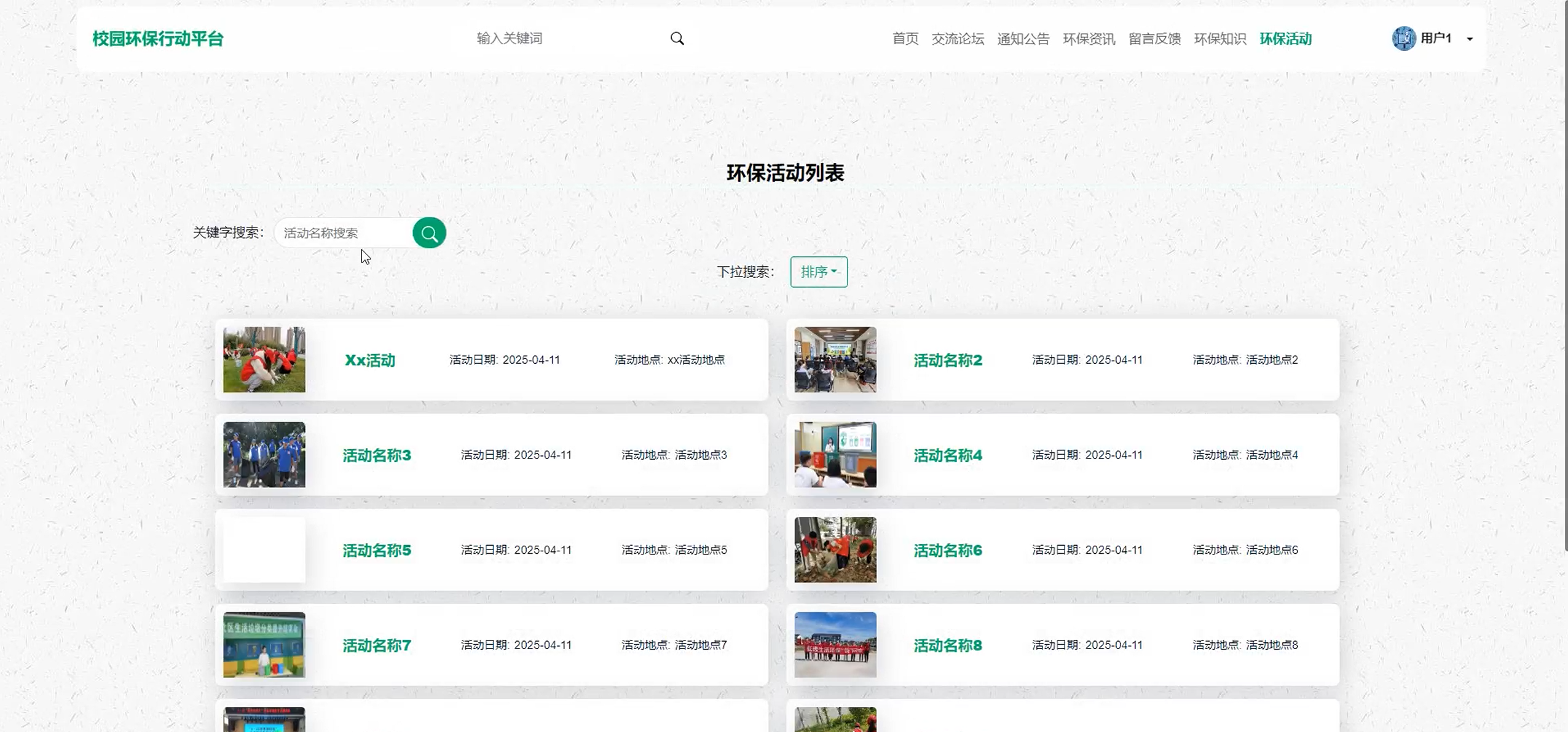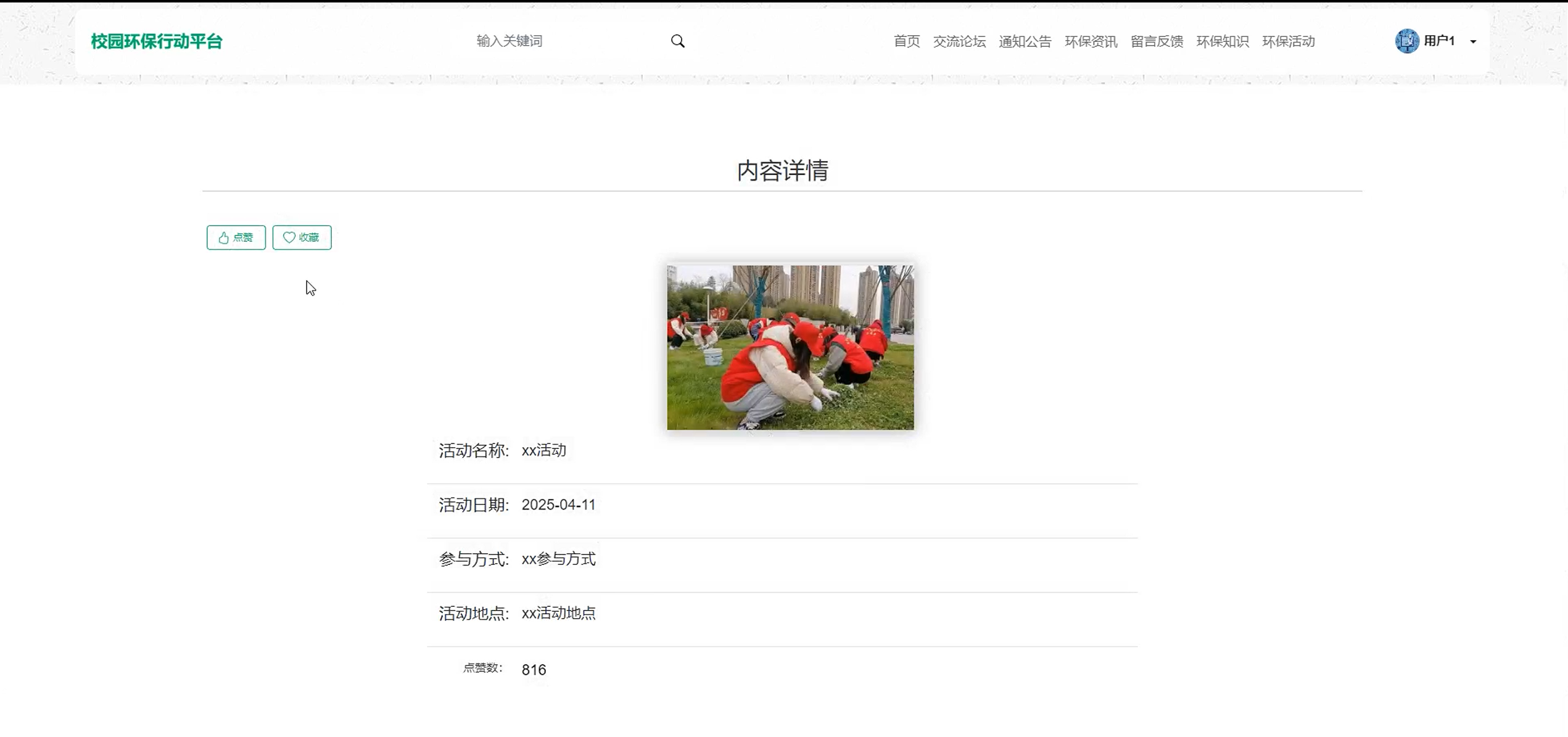 - 环保活动:用户可以查看当前正在进行的环保活动,并报名参与相关活动。平台通过活动管理功能,展示活动的详细信息,包括活动时间、地点、目标、参与方式等。