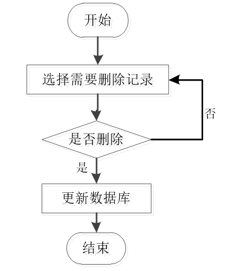 用户首先选择需要删除的记录,然后系统判断是否执行删除操作。如果用户选择不删除,则返回重新选择;如果选择删除,则更新数据库完成记录删除操作,最后结束流程。如图3-6所示。