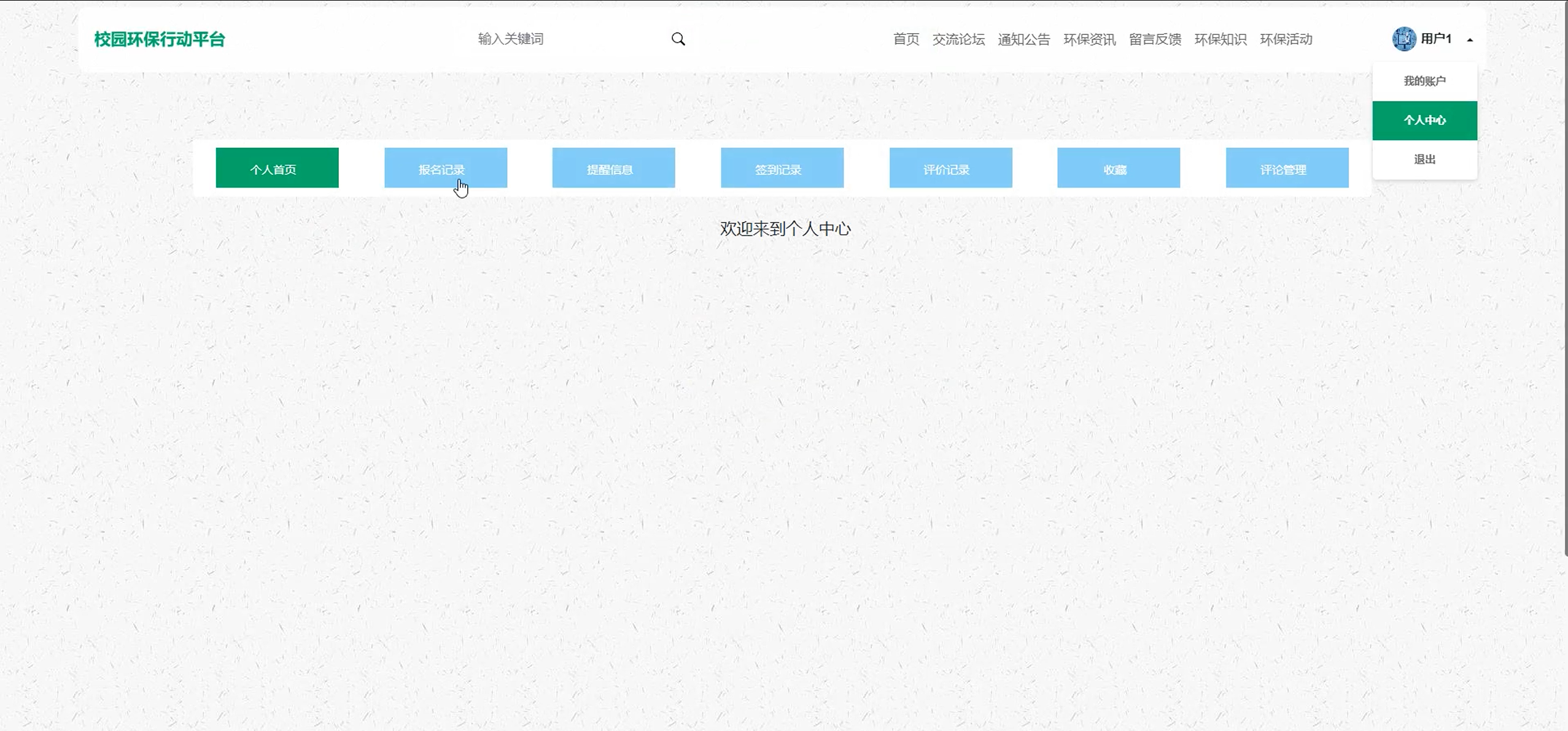 - 个人中心:个人中心包含多个子模块,用户可以通过此模块管理和查看个人的环保行为记录。具体包括: