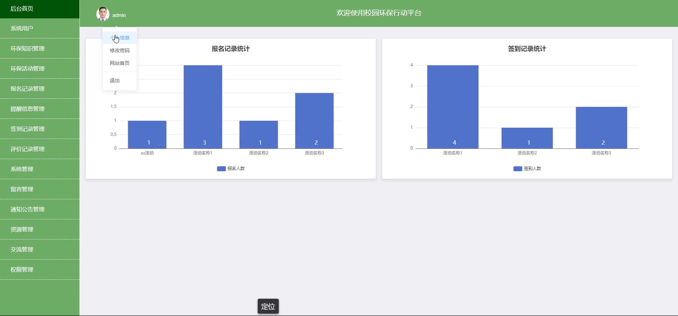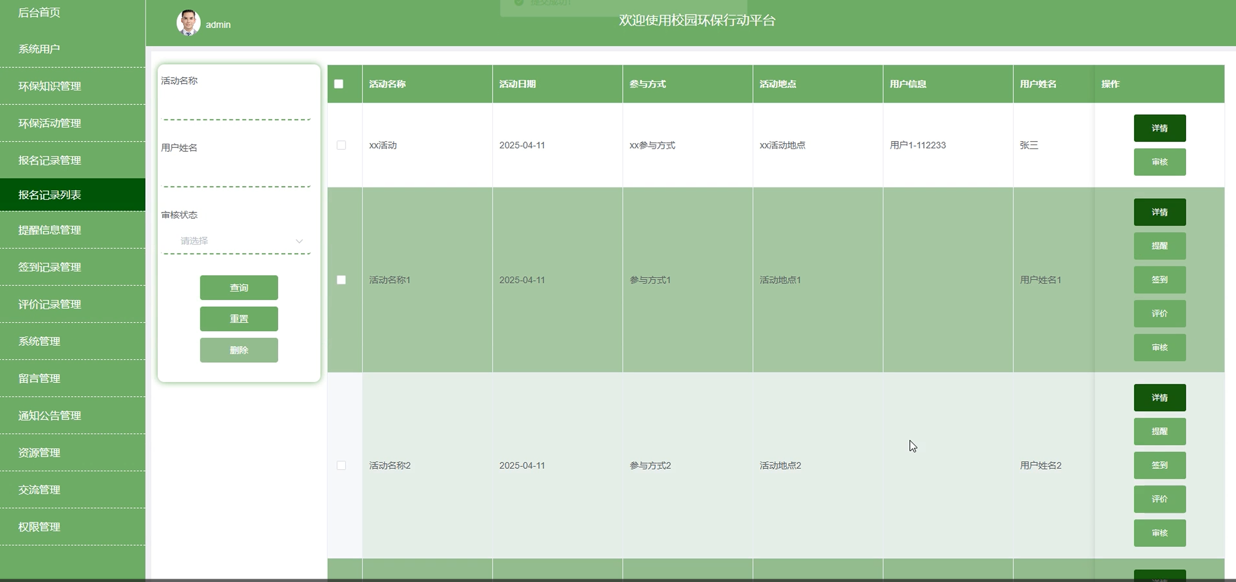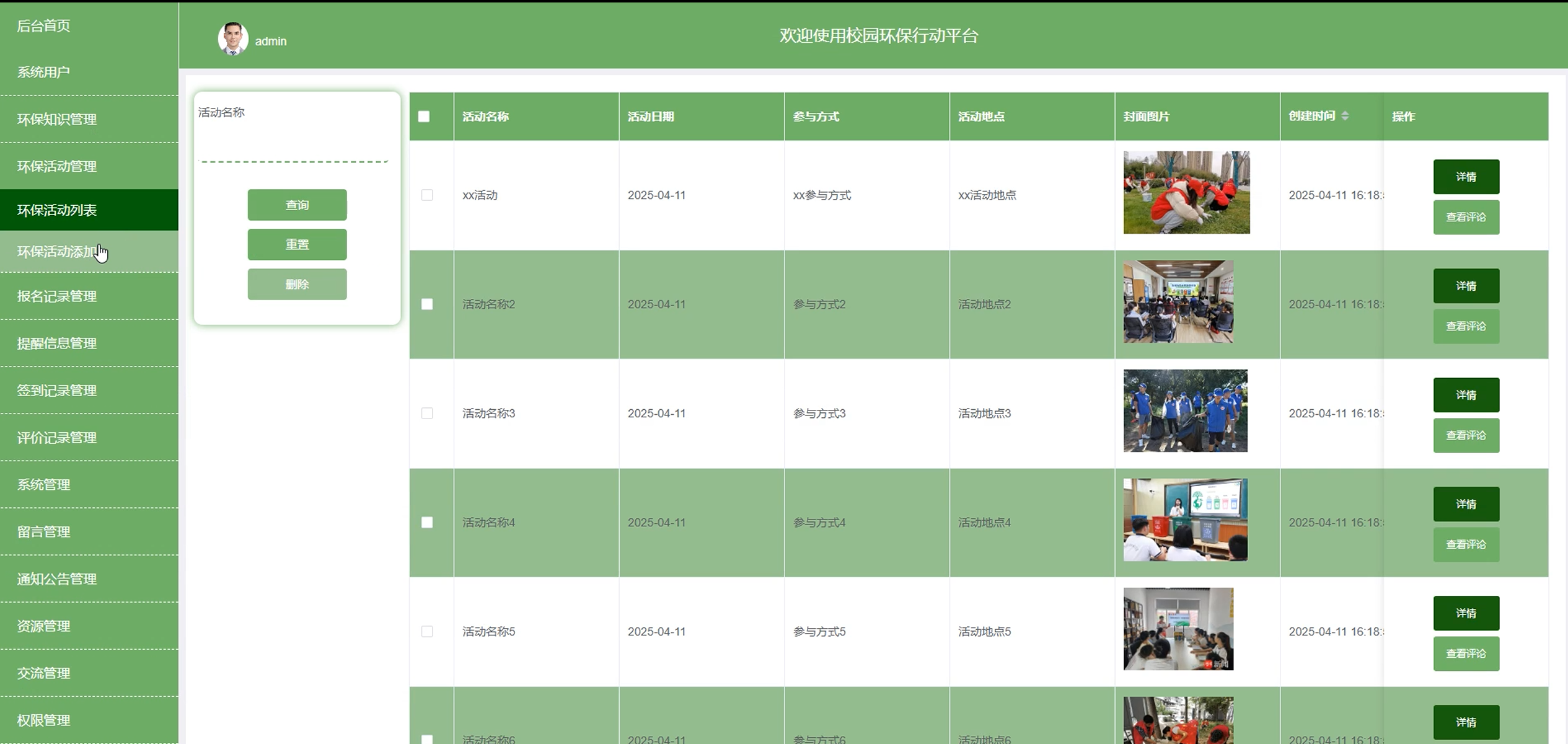 - 环保活动管理:管理员负责发布和管理平台上的环保活动信息,管理活动的发布、报名情况、参与人员等。确保活动信息准确发布,并跟踪活动进展。