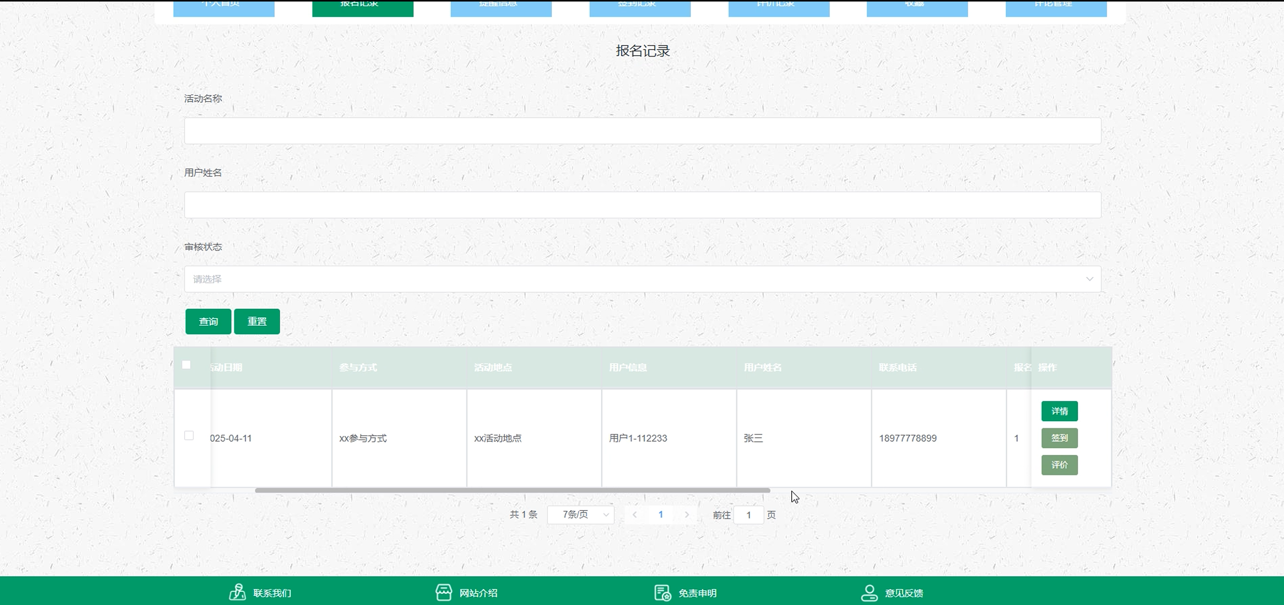 - 报名记录管理:管理员可以查看和管理用户的活动报名记录,审核报名情况,并处理相关事务,如活动名额分配、报名信息核实等。
