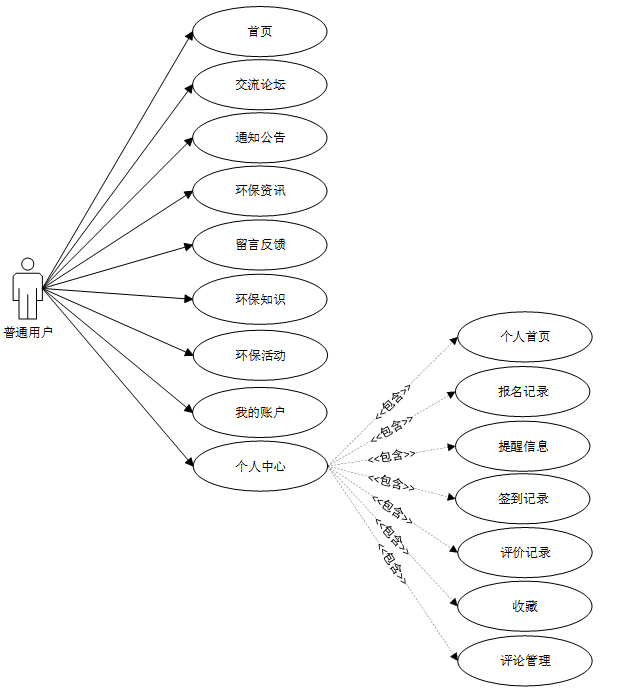 普通用户在平台上主要进行信息浏览、互动交流和参与环保活动等操作。用户可以通过平台查看环保资讯、参与论坛讨论、报名参加环保活动、查看个人账户和历史记录等。具体操作包括浏览和搜索环保活动与资讯、发布论坛内容、评论和点赞其他用户的帖子、以及通过个人中心管理个人信息和参与记录。此外,用户还可以在平台上查看通知公告、提供留言反馈,并参与签到活动,获取积分和奖励。用户通过这些功能实现与平台的互动,并积极参与到环保行动中。普通用户角色用例图如下所示。