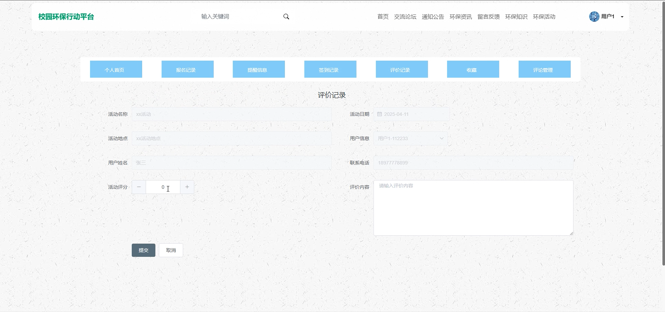 - 报名记录: 查看用户参与的环保活动的历史记录。