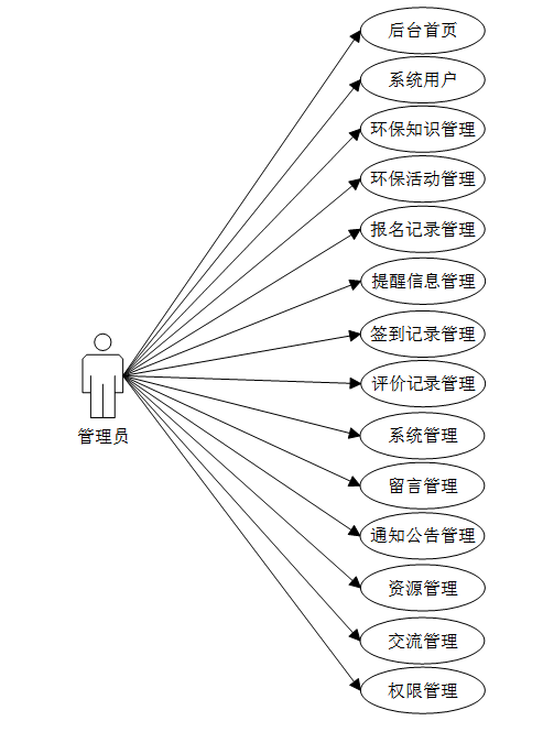 管理员在平台上主要负责用户管理、内容发布、活动管理和系统维护等多项任务。管理员可以通过后台管理系统,新增、修改和删除用户信息,管理用户权限,确保平台的正常运行。同时,管理员还负责发布环保知识、创建和管理环保活动、审核用户的活动报名及签到记录。管理员还需要处理用户的留言反馈,管理通知公告,审核论坛交流内容,确保平台信息的准确性和合规性。此外,管理员还负责资源管理和系统设置,优化平台的运行效率和用户体验。通过这些功能,管理员能够有效维护平台的日常运营和管理。管理员角色用例图如下所示。