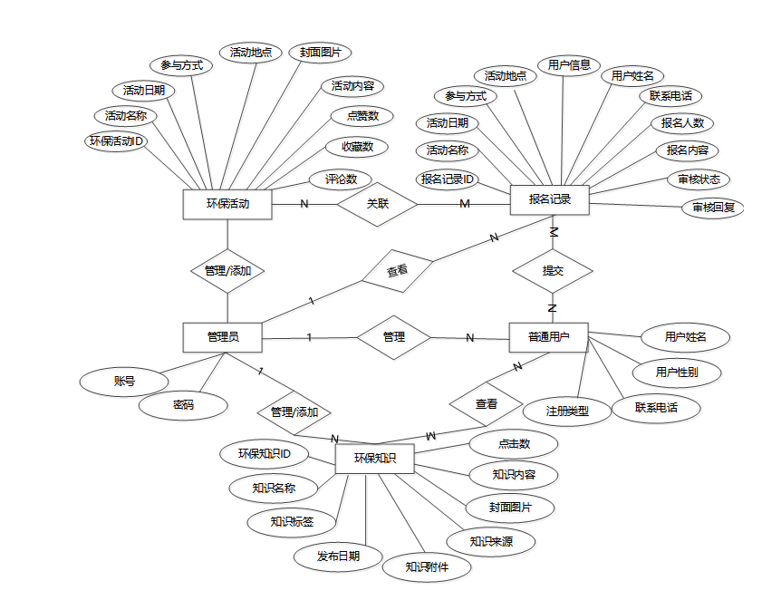 概念设计是指在系统开发初期,对数据和信息需求进行初步抽象与分析的阶段,明确系统中各类实体及其之间的关系。通过建立实体-联系模型(ER图),开发者可以清晰地表达业务流程中涉及的数据对象、它们的属性以及实体间的逻辑联系,为后续数据库逻辑设计和物理设计打下基础。该阶段不涉及具体的数据表结构,而是关注信息的本质和组织方式。基于Python的校园环保行动平台系统总体E-R图如下图所示。