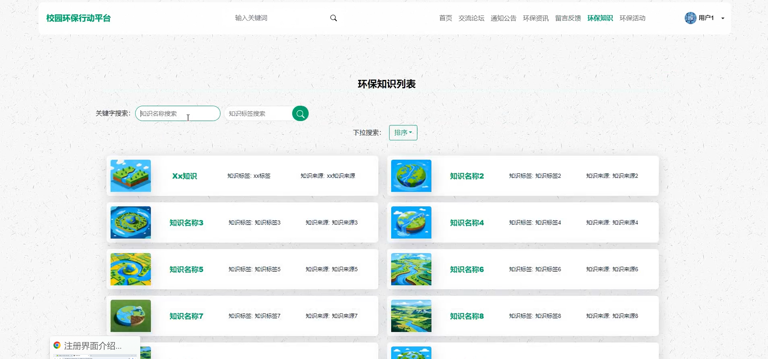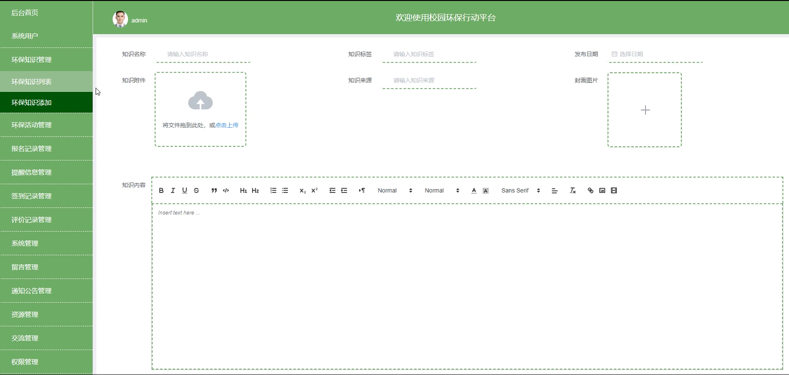- 环保知识管理:管理员可以在平台上发布和更新环保知识内容,包括文章、视频和图文资料。管理环保知识库,确保资料的时效性和准确性。