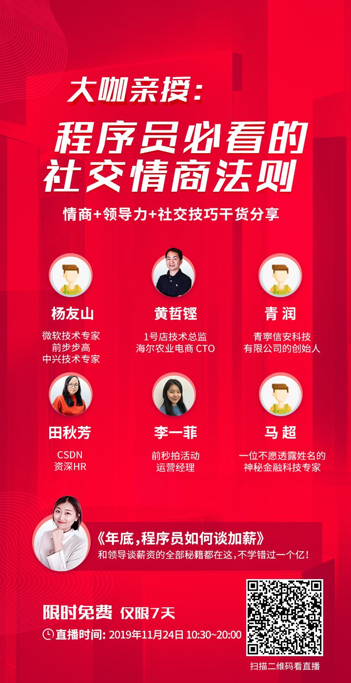这回,优快云特意准备了干货,告诉你“年底,程序员如何跟领导谈加薪”,让你的工资真正符合你的能力和付出。11月24日,一个小时的直播,大咖职场人和十年资深HR为你带来“谈加薪秘籍”,而这一切都是免费的!