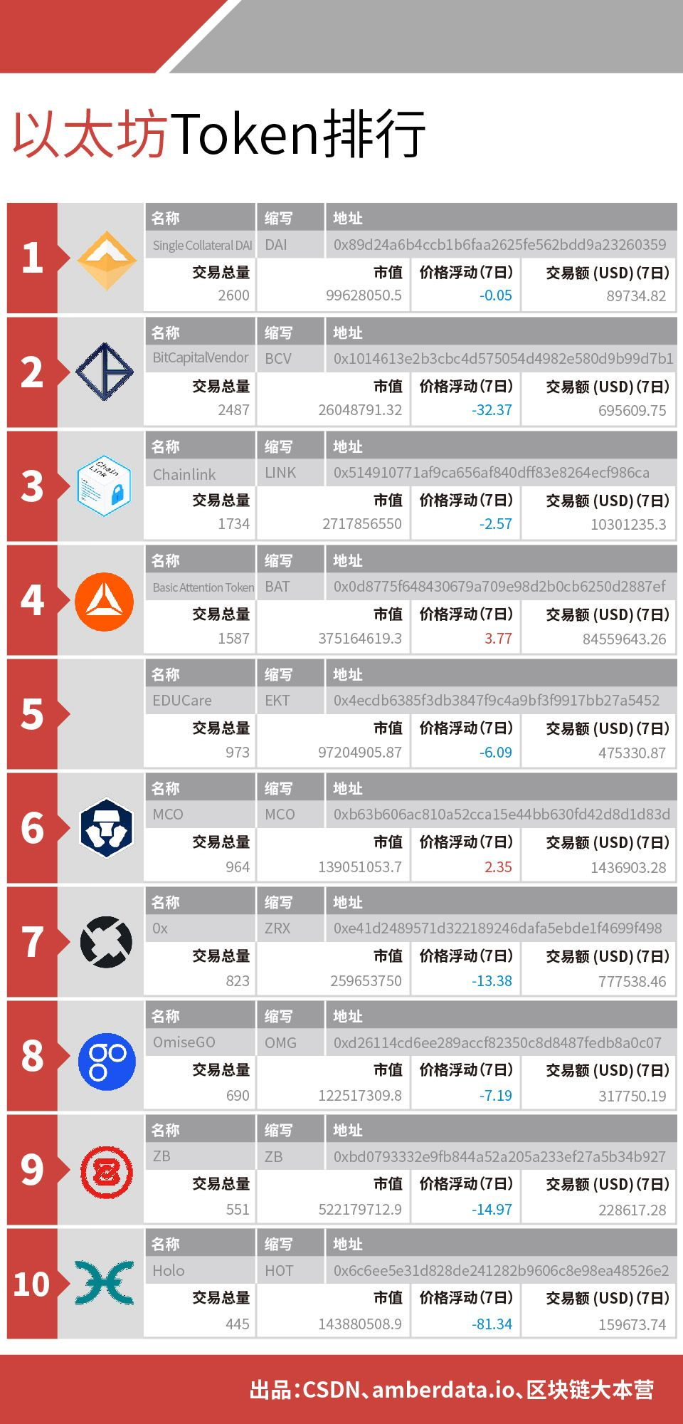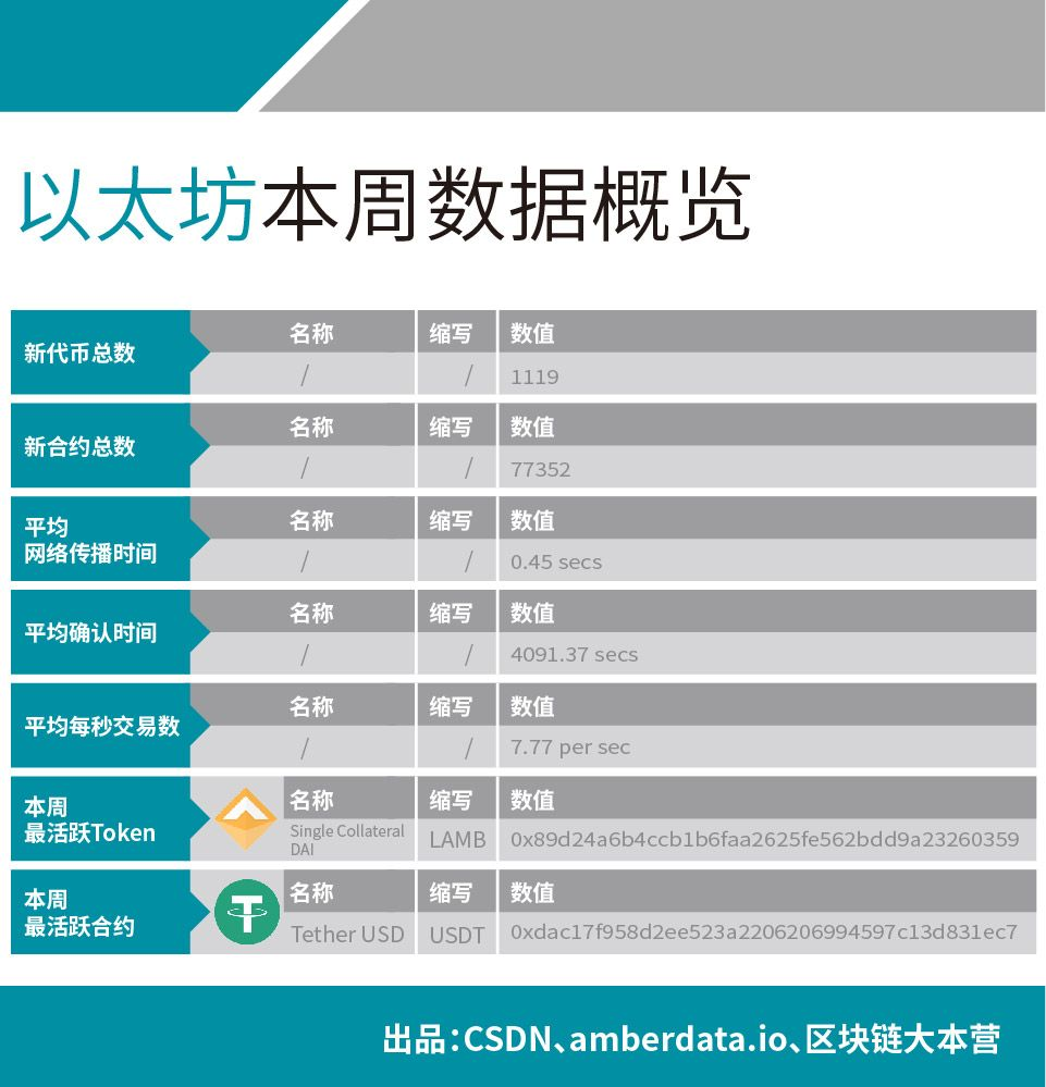 本周以太坊数据概览显示,SingleCollateral DAI在Token排行中领先,平均网络传输时间略有增加,智能合约用户量及交易量有所波动。