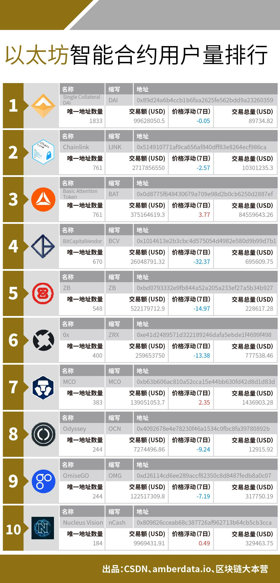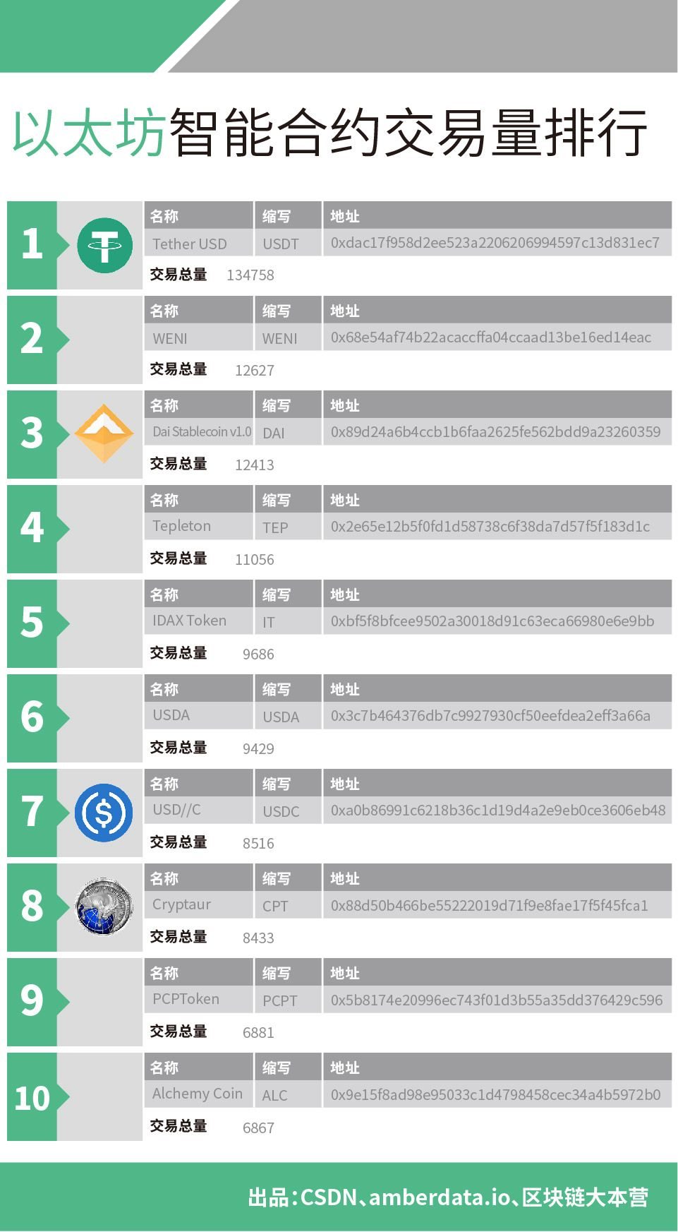 以太坊智能合约交易量排行榜内,位居榜首依然是老大Tether USD,第二名WENI的12627个交易总量,与上周第二名22862 个交易总量相比减少了许多。