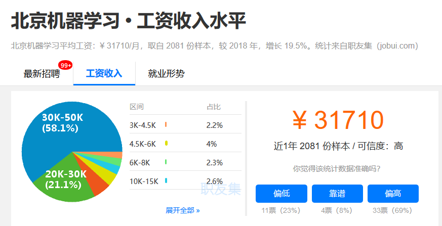 这一迹象,对于广大程序员来说,特别是对即将走向技术一线的准程序员而言,还是值得重点关注的。回顾一下移动互联网所带来的机遇,很容易就能算清,掌握AI能为一线工作带来怎样的优势。比如以下薪酬数据,就让笔者大吃一惊,数据来自于职友集网站2020年2月3号数据: