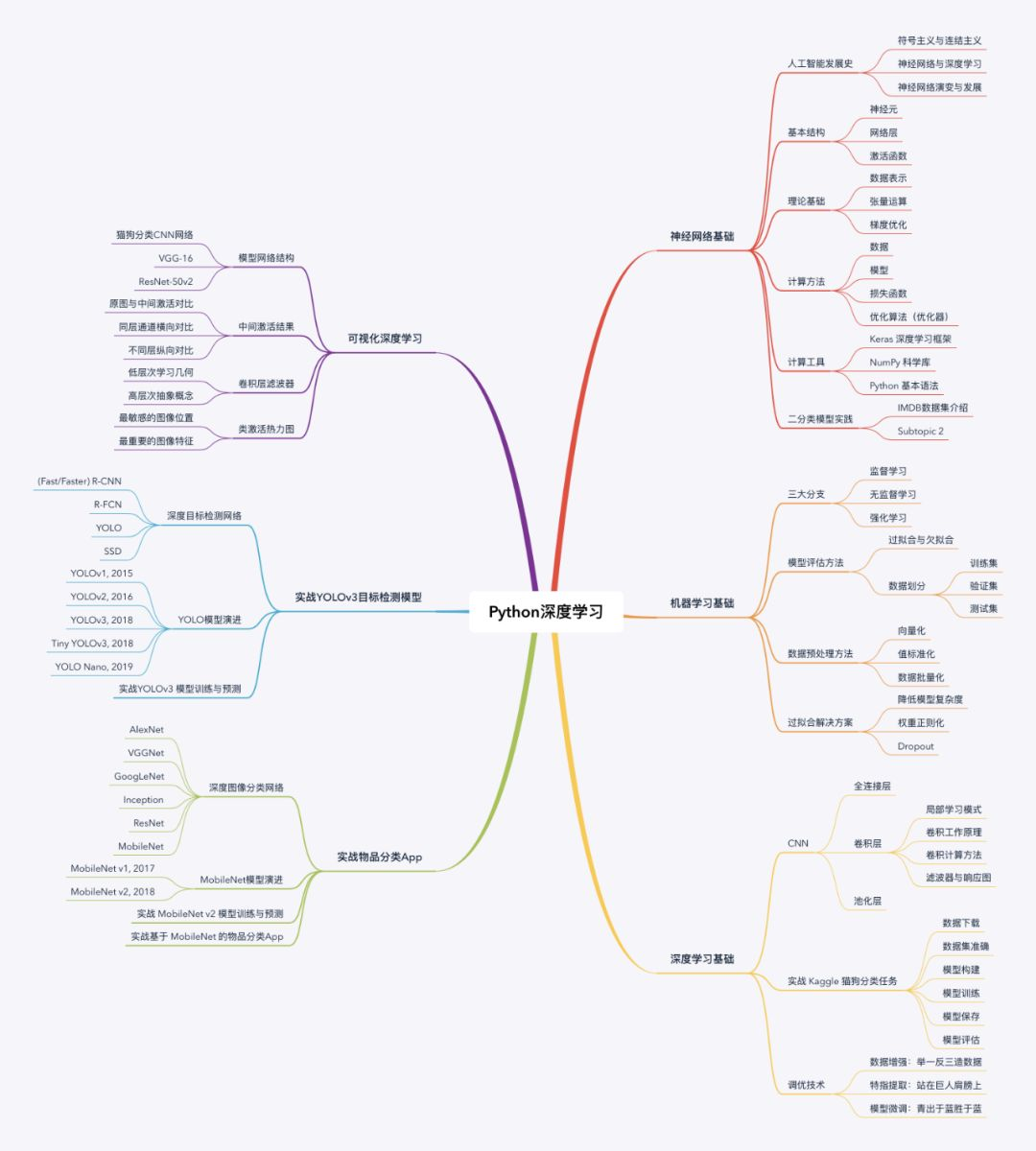 整个课程以理论加实战为核心,从基础原理、代码案例、模型设计、训练流程、模型评估、参数调优、服务部署铺开,带你手把手入门深度学习,一次性系统掌握实践深度学习的所有知识和流程。下面是课程的知识概览思维导图。