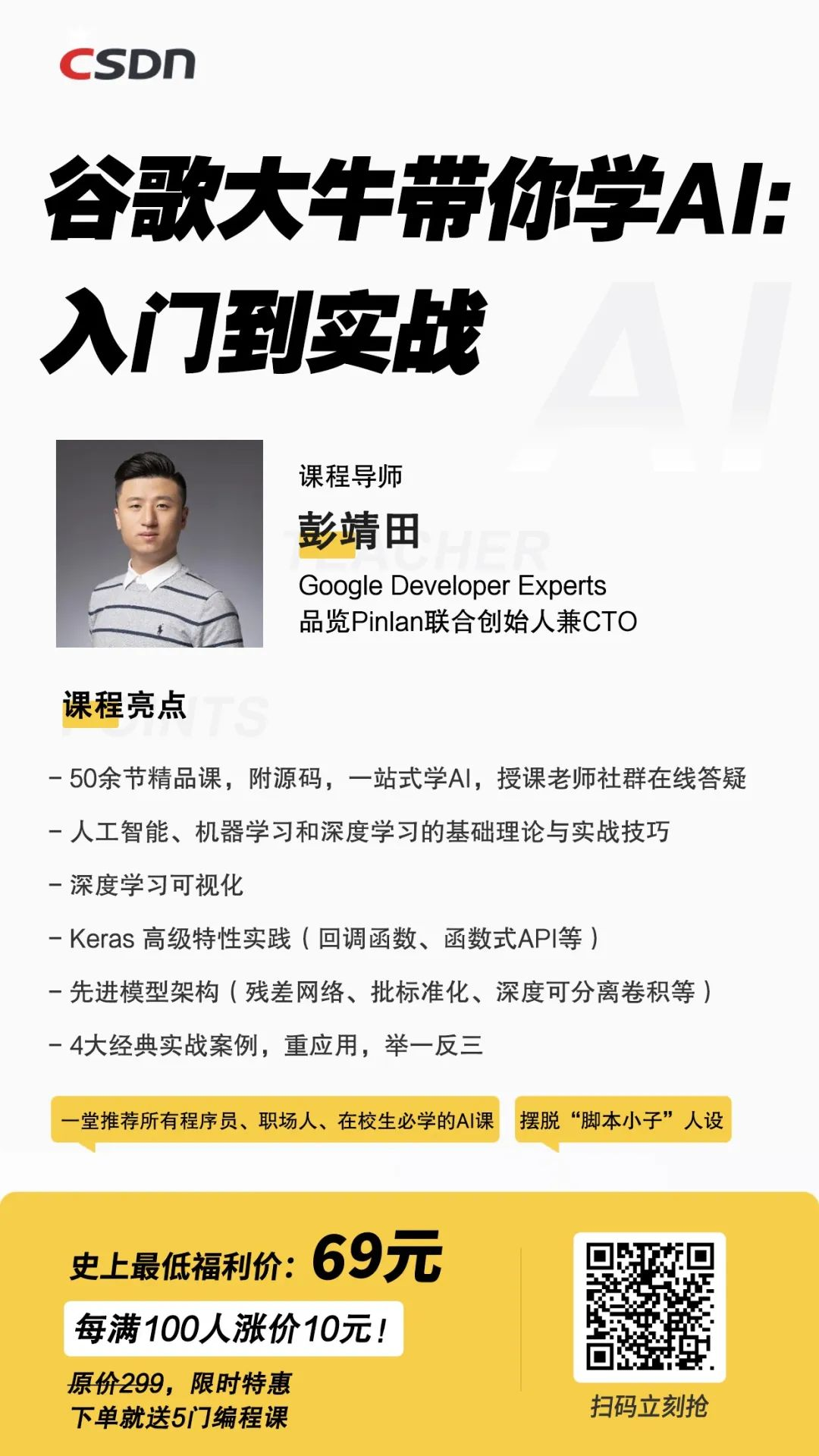 基于这个思路,我向你推荐彭靖田老师的《Google开发大牛带你学 AI:入门到实战(Keras/Tensorflow)》。