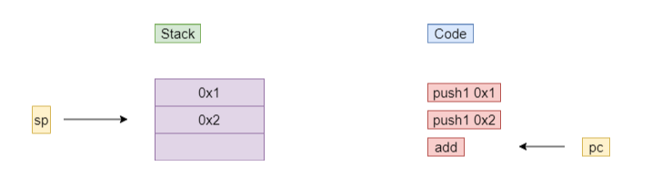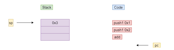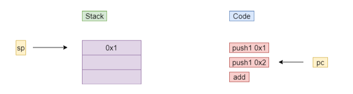 这里用半动画的方式解释其执行过程。下图中,sp表示栈顶指针,pc表示程序计数器。当执行完push1 0x1后,pc和sp均往下移: