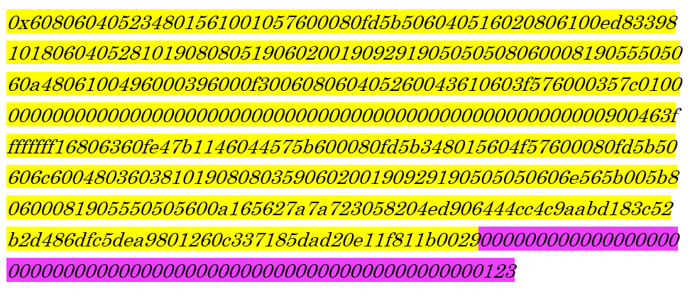 上面这段数据中,标黄的部分正好是前文中的合约二进制;而标紫的部分,则对应了传入的构造参数0x123。