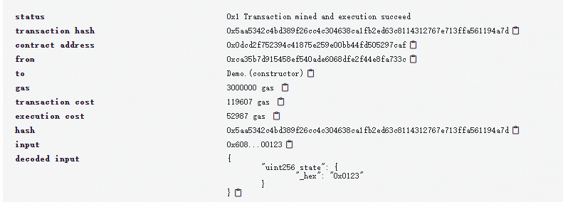 节点执行交易,结果就是智能合约Demo被创建,状态字段_state的存储空间被分配,并被初始化为0x123