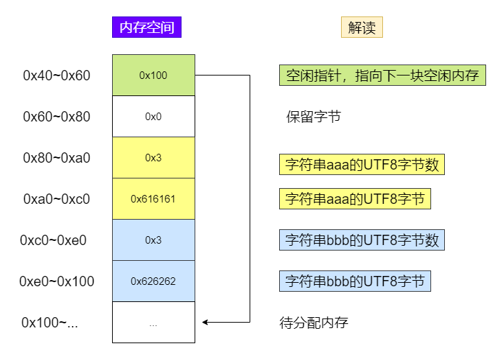 0x40~0x60:空闲指针,保存可用地址,本例中是0x100,说明新的对象将从0x100处分配。可以用mload(0x40)获取到新对象的分配地址。