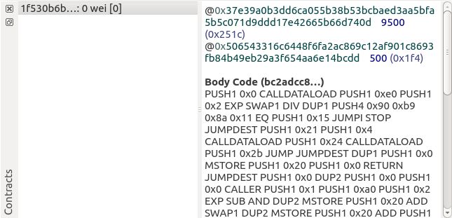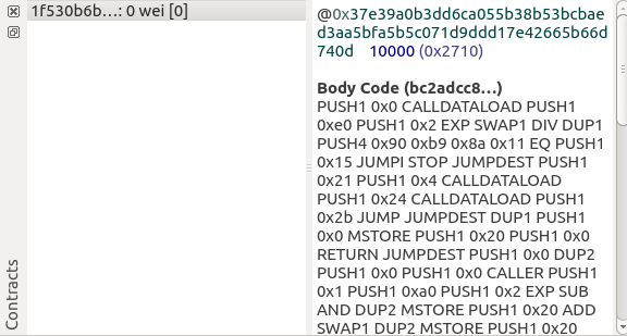 现在您有一个“待处理”(Pending)智能合约,您需要通过挖掘一个块来将这个事务提交到区块链上(在一个实时网络上,任何其他挖掘的人都将接收到这个事务,并试图将其包含在挖掘到的块中)。点击‘矿池’(Mine)按钮进行挖矿,直到事务状态从“待处理”(Pending)转为“智能合约”(Contract)状态。点击‘矿池’(Mine)按钮再次关闭挖矿,并在智能合约窗格中单击您的新合约。您将看到如下所示的内容: