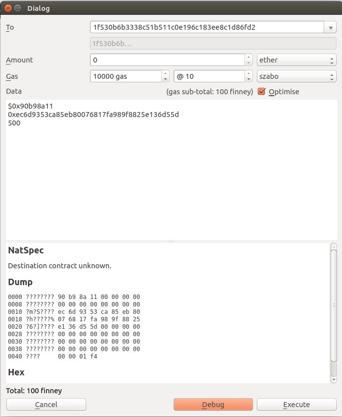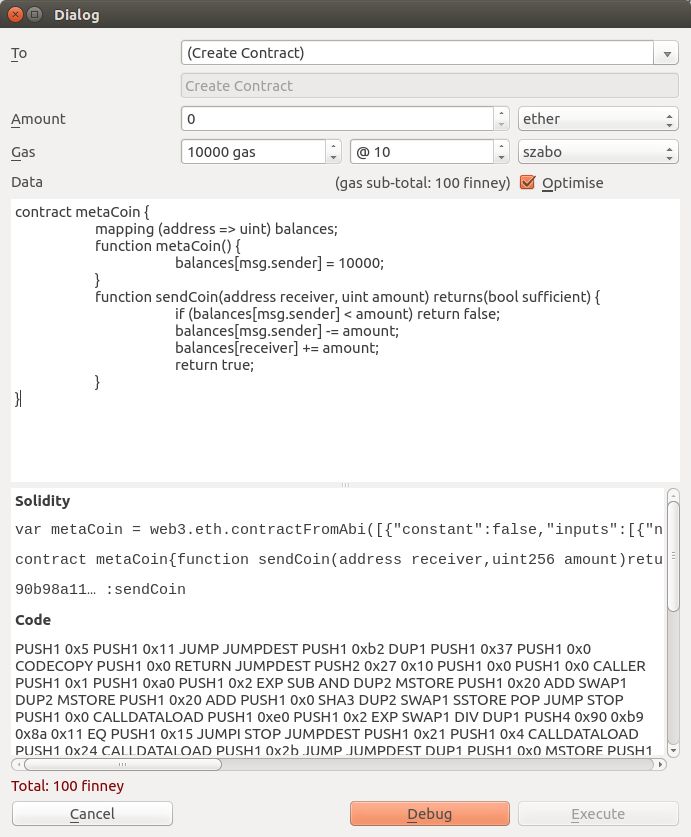 由于我们正在尝试创建智能合约并且不会将以太币发送给其他帐户,因此您可以安全地将所有字段保留为默认值。我们将以10 Szabo的价格标定每单位瓦斯来发送智能合约。Szabo是另一个价值单位,相当于0.000001以太币。由于我们的合同创建代码非常简单,因此我们将得到退还的大部分费用,因为智能合约的保存不会消耗所有的瓦斯。