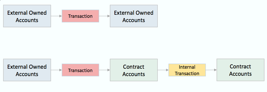 智能合约是看得见摸得着的数据包,而交易只能用我们的肉身来发现。在整个以太坊网络里,交易只有两种类型:一种是通过普通账户发起一个对普通账户的交易;另一个是通过普通账户发起一个一个对合约账户的交易。