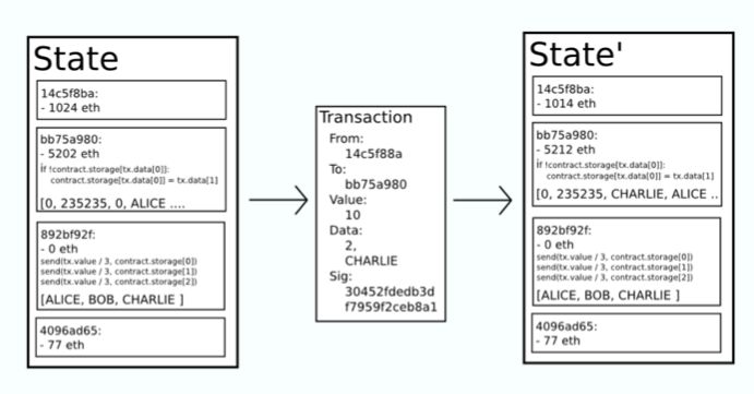 抽象来看,无论是那种账号的背后都是一个统一的以太坊的状态,以太坊也可以被看成是基于交易(Transaction)的状态机,一个一个的状态不断地变化着。