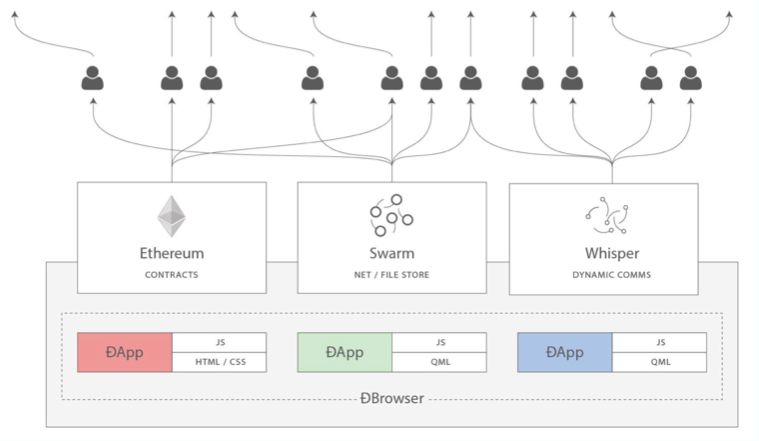 区块链的Dapps也类似,只是基础设施变成了区块链,硬件变成了矿工的节点,再往上,业务层代码变成了智能合约,最上面是你自己本身的业务。