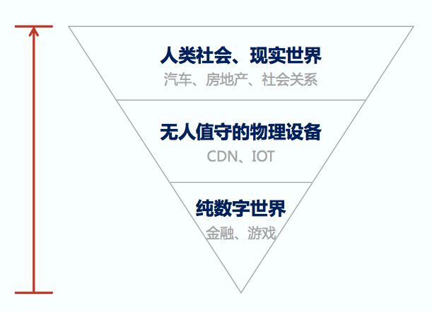 我个人把整个人类社会分为三层:最下面一层是纯数字的世界,不需要有什么物理设备的存在——交易金融、跨境支付、玩游戏、天气等场景,都没有一个物理的实体存在。区块链在这一层表现的很好,尽管还存在一些小问题。