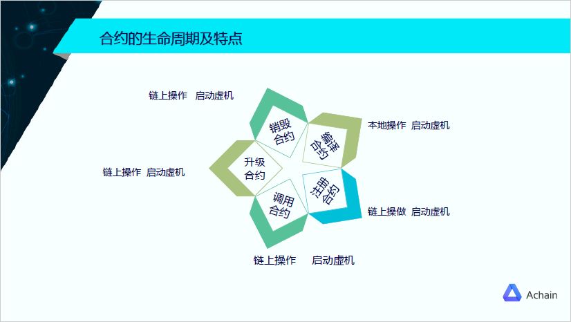 我们都知道区块链是不可篡改的,对此,升级合约就比较重要了。对于临时合约,可以被销毁,也可以被升级。一旦被升级以后就常住链上,永远不会被销毁掉。这个升级合约也是链上操作启动虚拟机制,是我们Achain合约对外的接口。