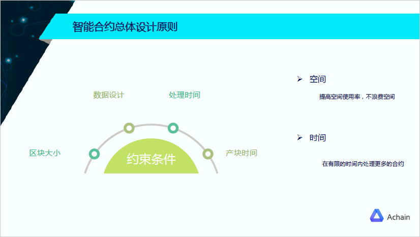 这四个约束条件特别有意思,区块大小和数据设计,讲的是空间的问题;处理时间和产块时间,讲的是时间的问题。这两个问题是鱼和熊掌不能兼得,让处理时间和数据设计尽可能达到一定平衡。数据设计其实是跟这四个里面最重要的一点,因为数据设计不合理,会直接影响你的储备时间,影响合约调度的效率。