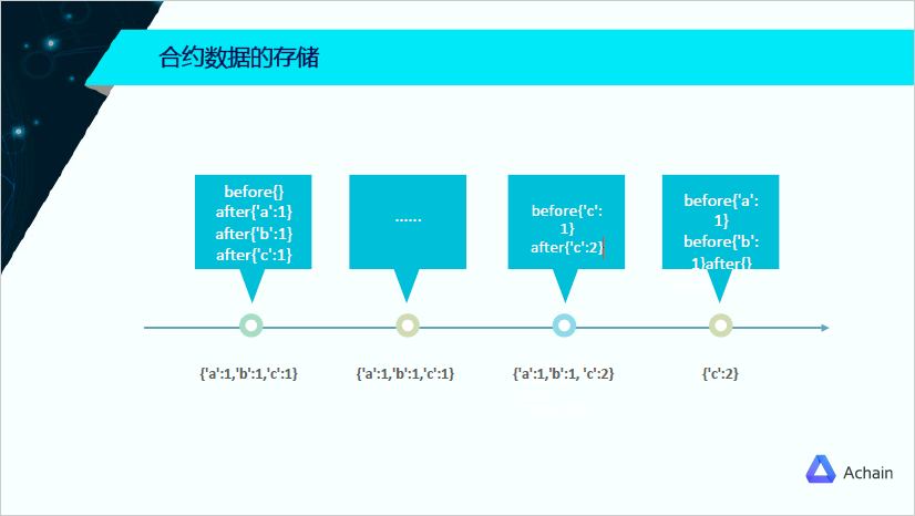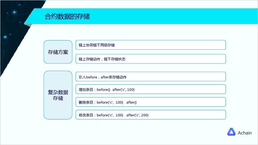 首先,看第一点数据设计,Achain能够提供一整套完整数据的存储和存取。